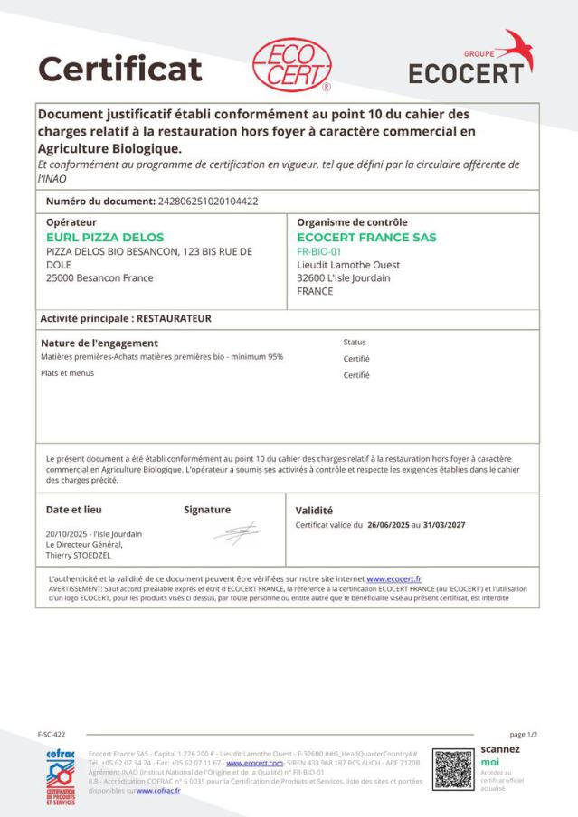 C'est pour cela que PIZZA DELOS a tout mis en oeuvre afin de vous garantir que nous vous proposons dans nos pizzas, boissons et désserts uniquement des produits certifiés bio, tout cela par un audit annuel et un contrôle de tous nos produits et factures. vous trouverez le dernier Certificat Bio CLIQUEZ ICI